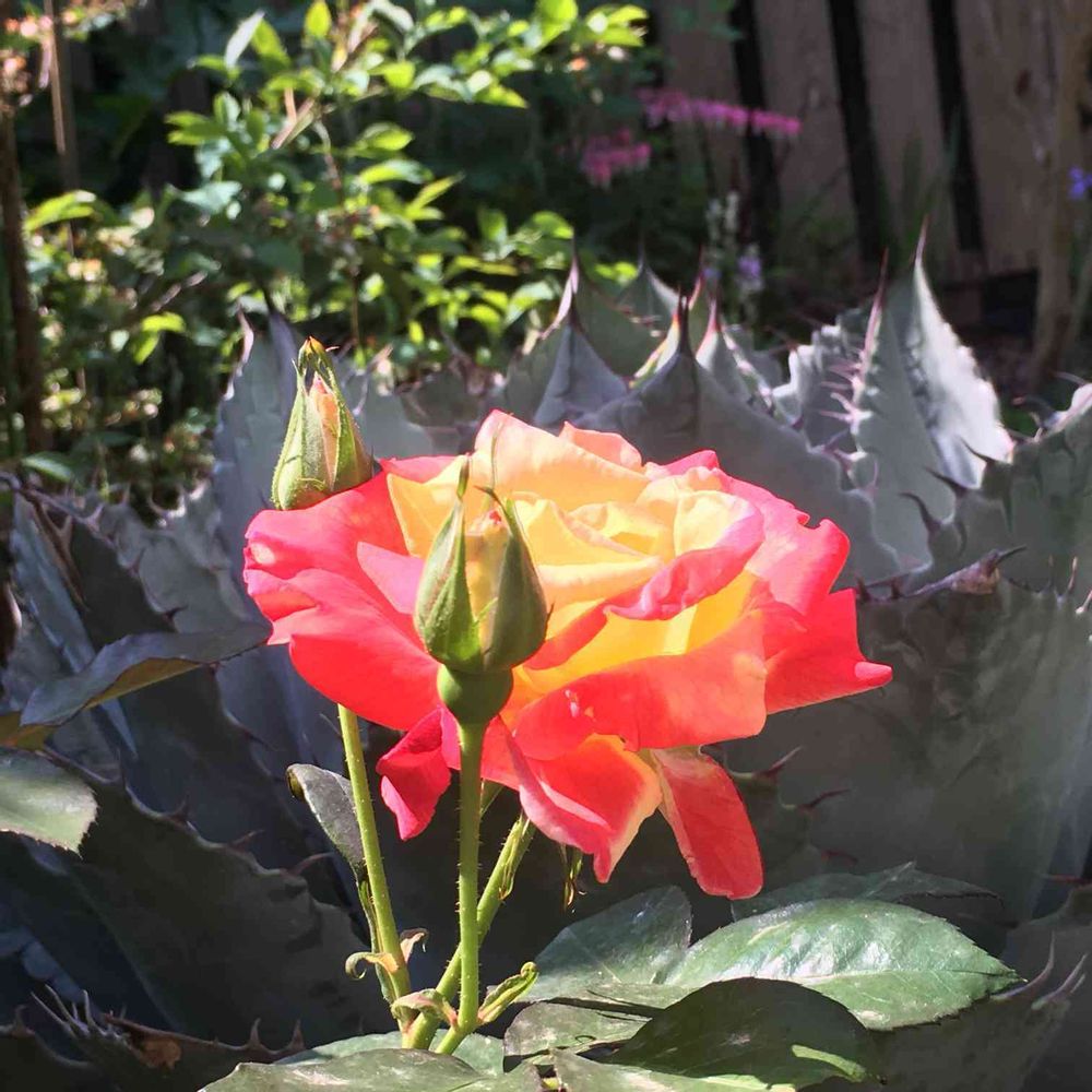 こんにちは😃アガベバックに薔薇🌹なんて最高です😍我が家の薔薇はまだ小さい蕾🌹咲くのが楽しみです
