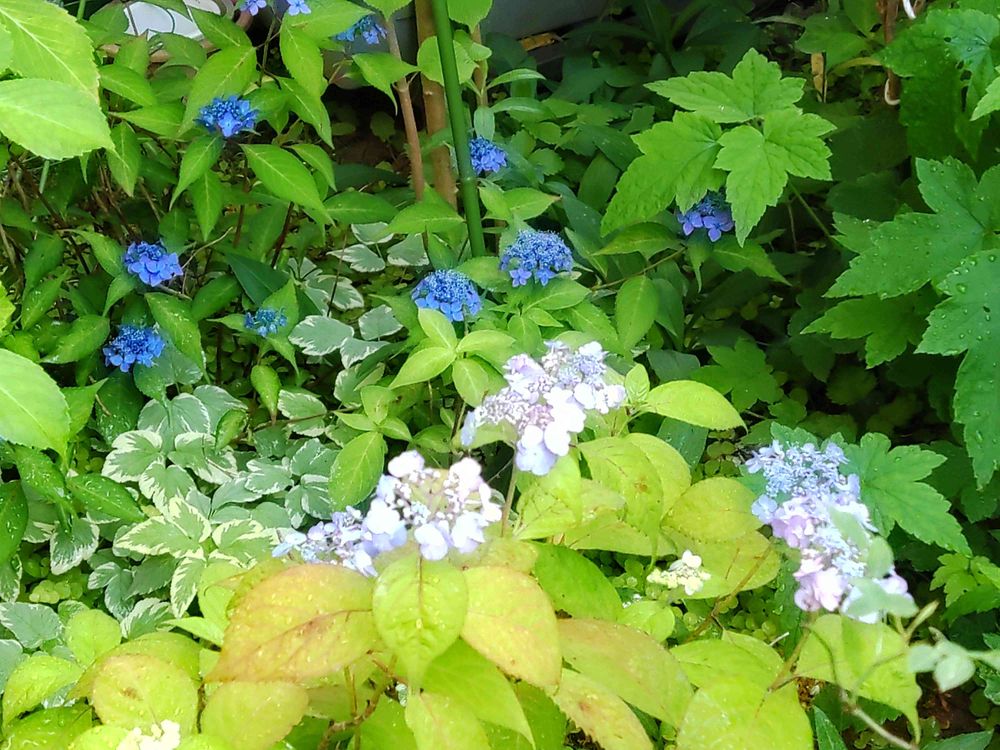 紫陽花の藪に山紫陽花の鉢群……手間がかからないので増えてしまう💦💦