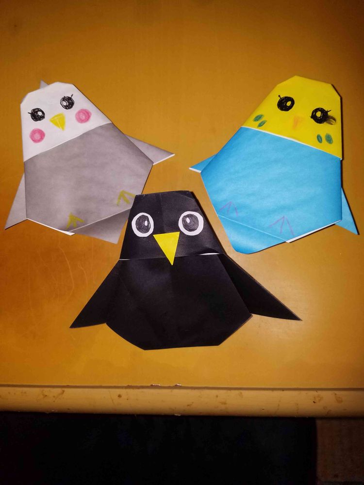 セキセイインコの折り方しか出てなかったんだけど、自分で考えてちょっと色を変えたら、オカメやカラスになるんじゃないかな?って作ってみた😃😃☺️💕