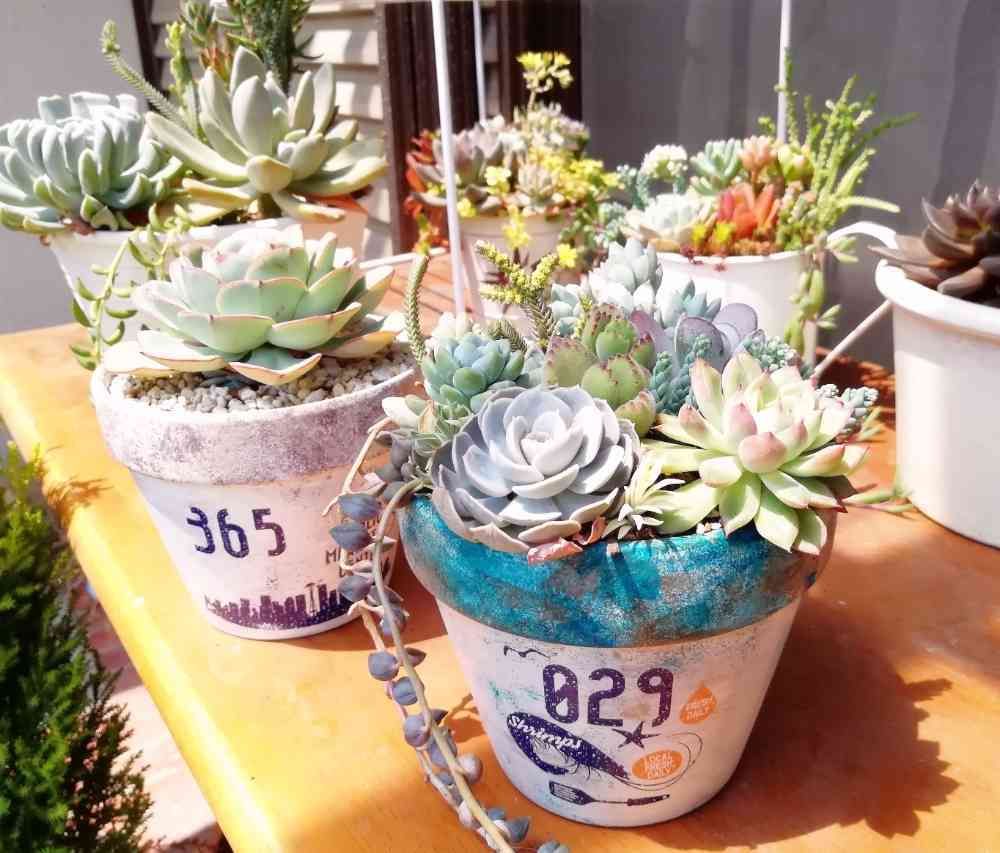 ひとつは鉢の色に合わせて緑や青系の多肉寄せ植えに、