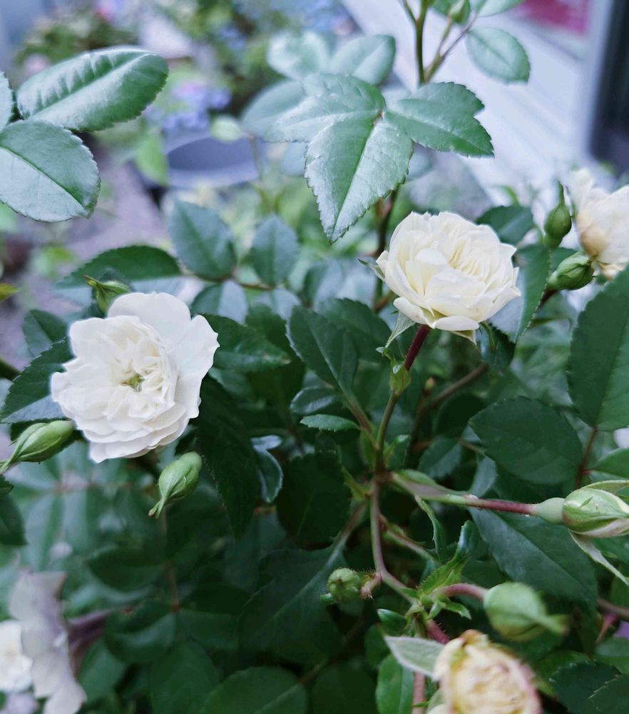 クレマチスミゼットブルーも新しい枝を伸ばしていて、つかまるところを用意してあげないとな、と雨の中眺めておりました
