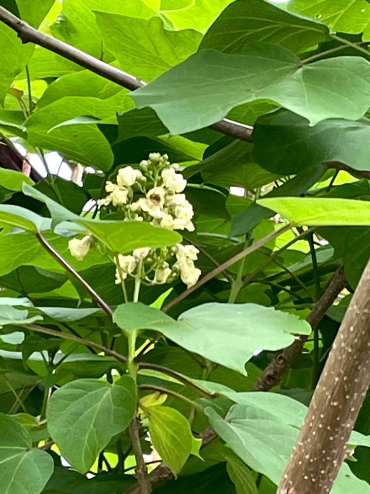 キササゲというのですが。特徴的な細長い実は、見たことあります。なんだろうと思ってました。花に気づいたのは初めてかも。この木も実をできるのを楽しみにしてます。