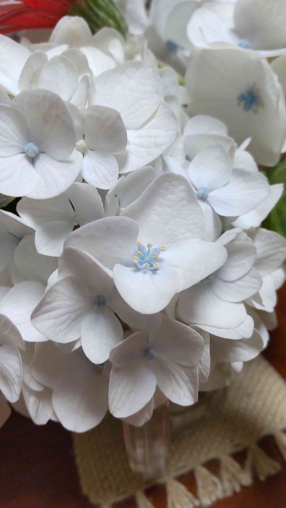 我が家のオーソドックスな白いアジサイですが、段々と薄い水色になっていくので、ホントのお花部分も水色なんですかね。