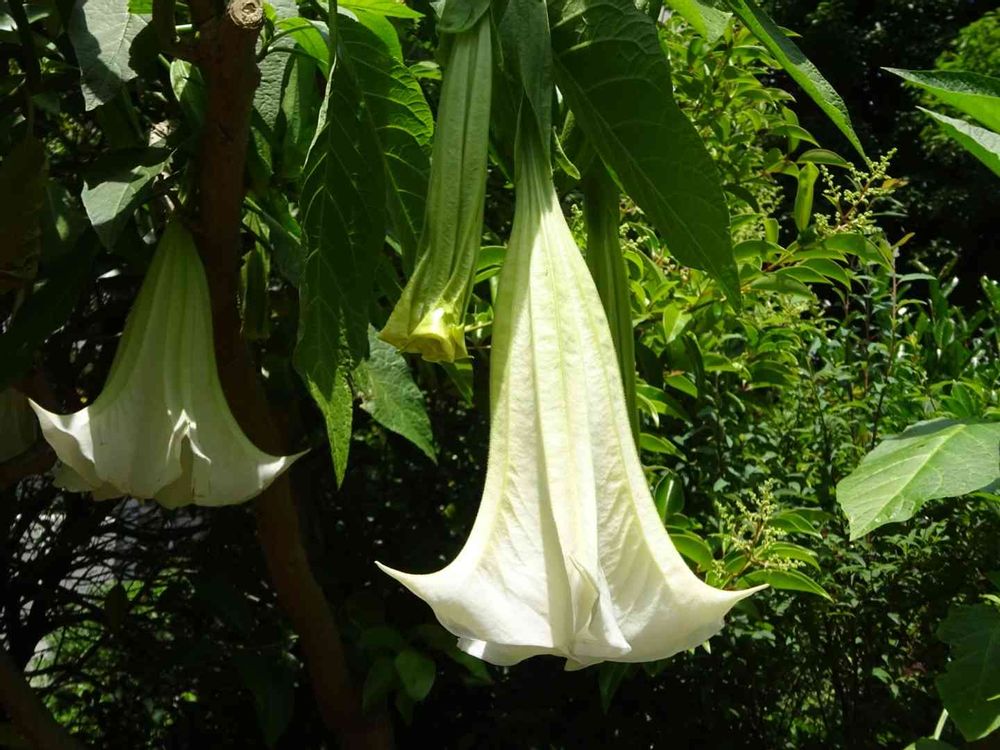 よく混同されるエンゼルストランペットは「キダチチョウセンアサガオ」です。上を向いて咲くのはチョウセンアサガオです。