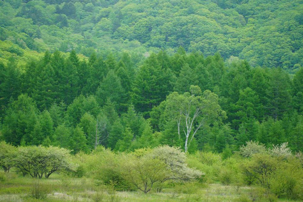 日光戦場ヶ原の新緑がとても綺麗でした。「小田代ヶ原の貴婦人」と呼ばれる白樺が遠くに見えます。戦場ヶ原の新緑の風景があまりに綺麗だったので。みどりのまとめにも記録しておきました。