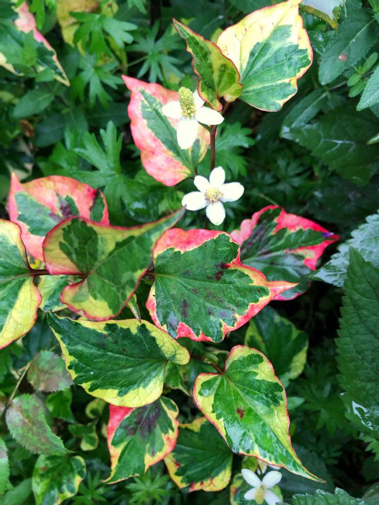 栽培の歴史は古く、江戸時代に作出された「斑入りドクダミ」がヨーロッパに渡り、園芸品種となって普及し、逆輸入されたものが現在のゴシキドミダミとなります。