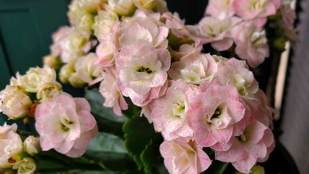 カランコエ クイーンローズ(白)はピンクの絞りのような色がつき始めました。