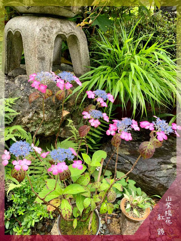 しっとりとした石灯籠や和の草と共に育つ、紫陽花の自然の形が美しいです。