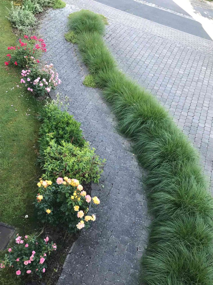 家に入ってくるエントランスを2階の書斎から写してみました。今は薔薇が綺麗な良い季節☺️ 駐車場との境にはカレックスコマンスを植えてますが、この季節は青々としてます。😊