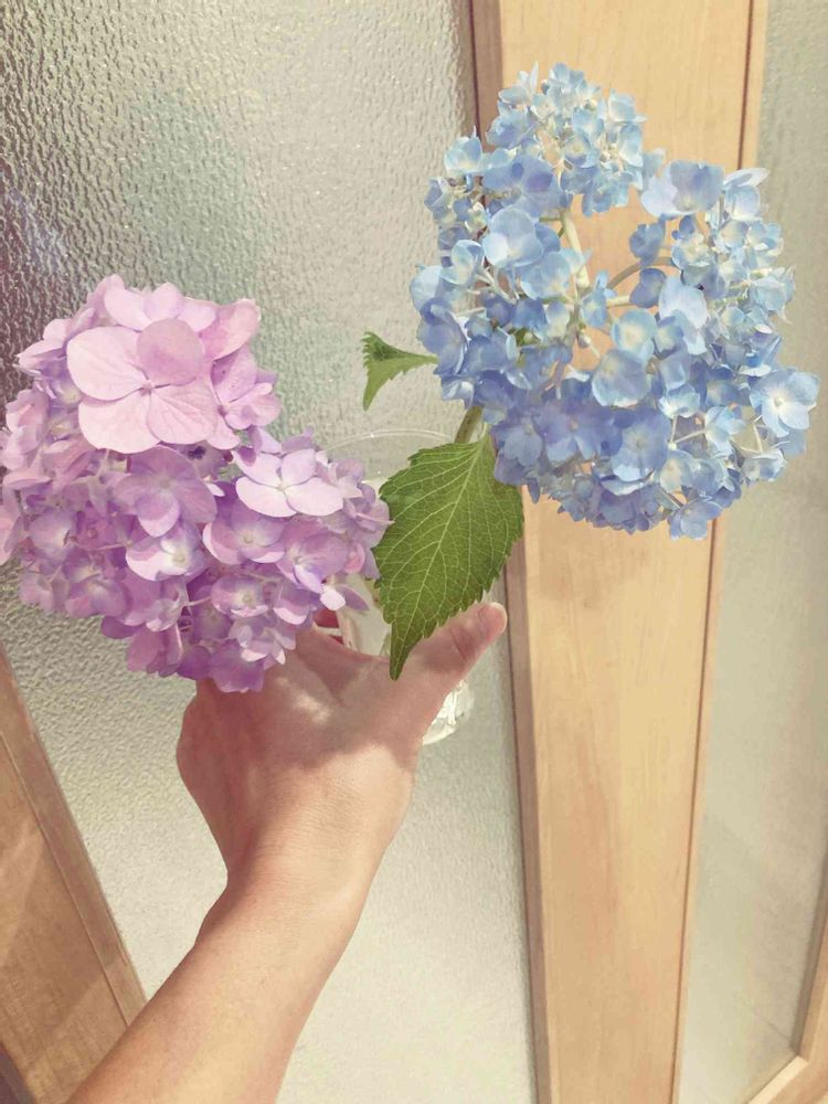 同じ株から二色の紫陽花。青が2輪あとはフジ色。来年は青がたくさんなるといいな。