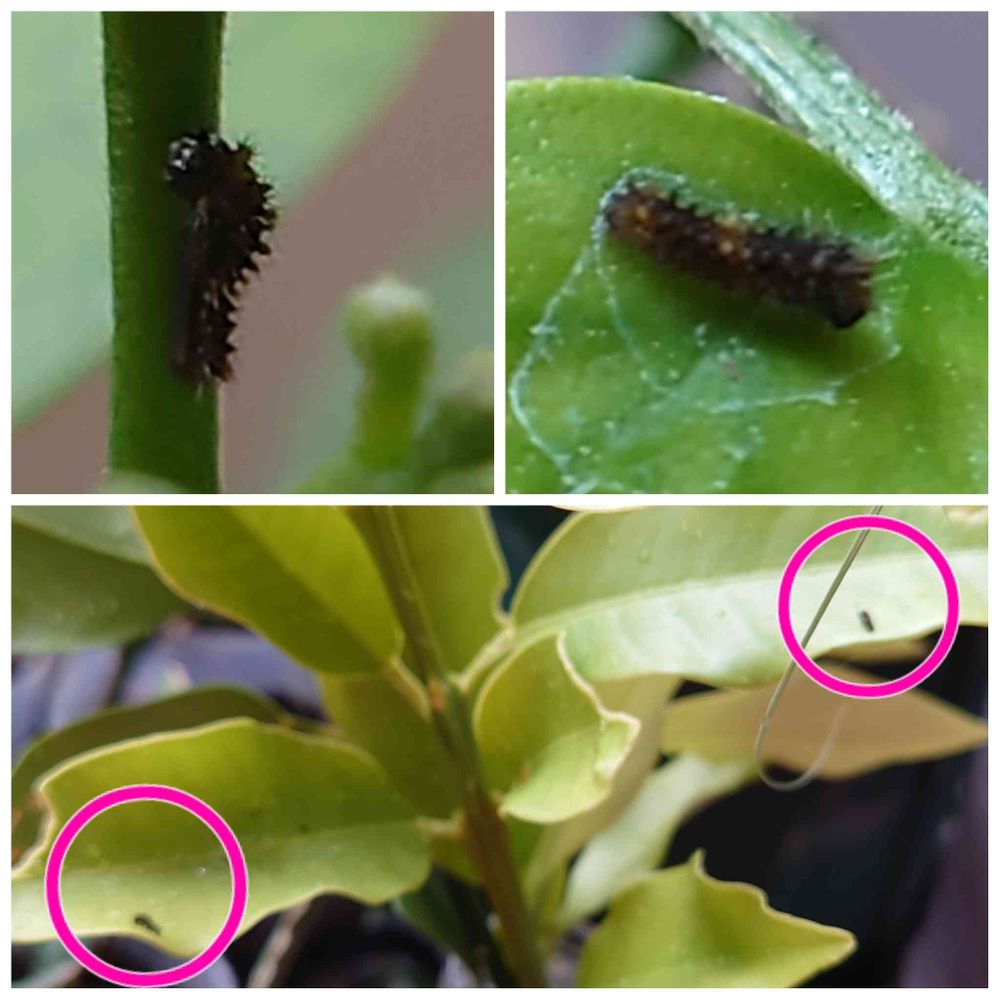 3〜4ミリと小さい幼虫なのでいるのに気づかずに運悪く今日は他の株にニームオイルの散布をしちゃったのでヤバイ😨一階から餌になる葉取って来て移動させました!左の子はずっと同じ場所にいるけど大丈夫かな・・😓