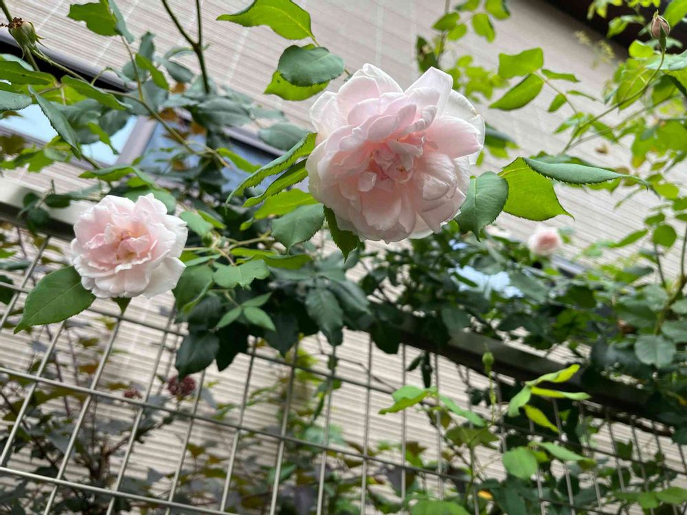 家の裏でいつも大暴れのマダム・アルフレッド・キャリエールさん🌹美しく清楚なお花です。冬にバッサリ太くなった枝をノコギリで切りました😊それでもやっぱり暴れ気味😅樹勢が強くて素晴らしい✨✨✨