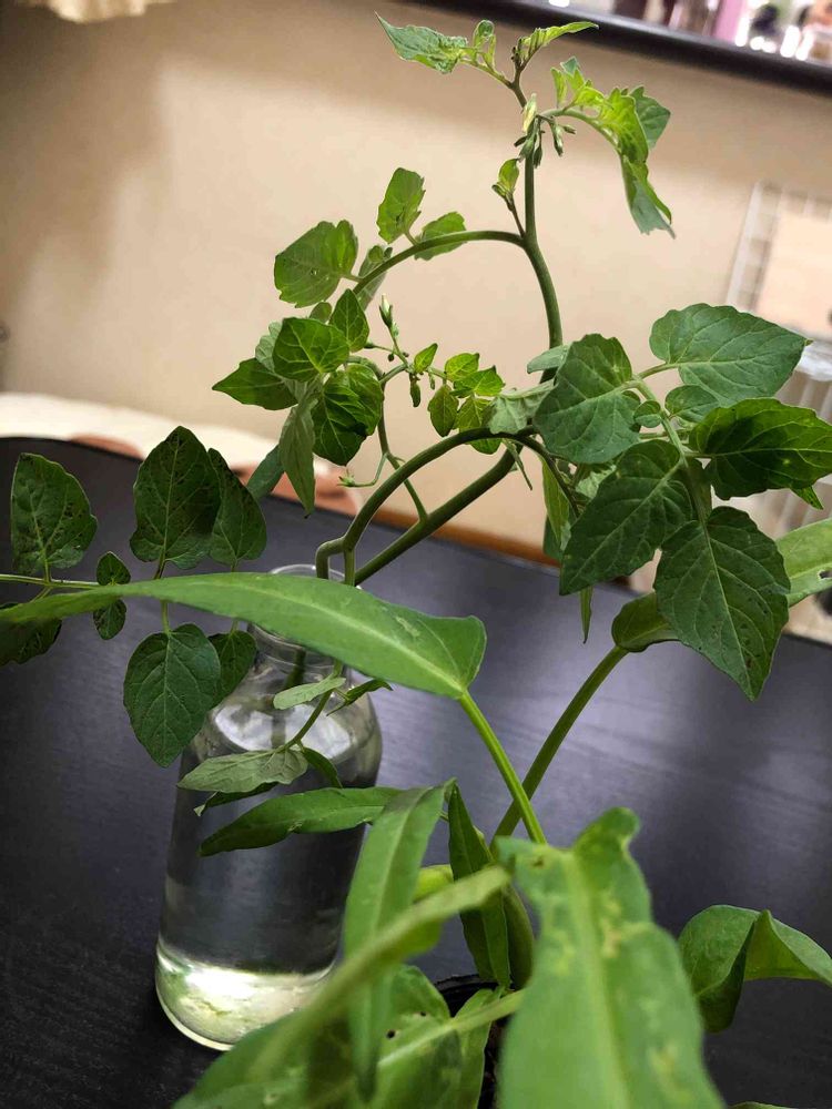 マイクロトマト→脇芽切ったやつでこのまんま水に浸けとくと根が出てくるよー!そしたら土に植えてね!ちっこい可愛いトマト出来るよー!