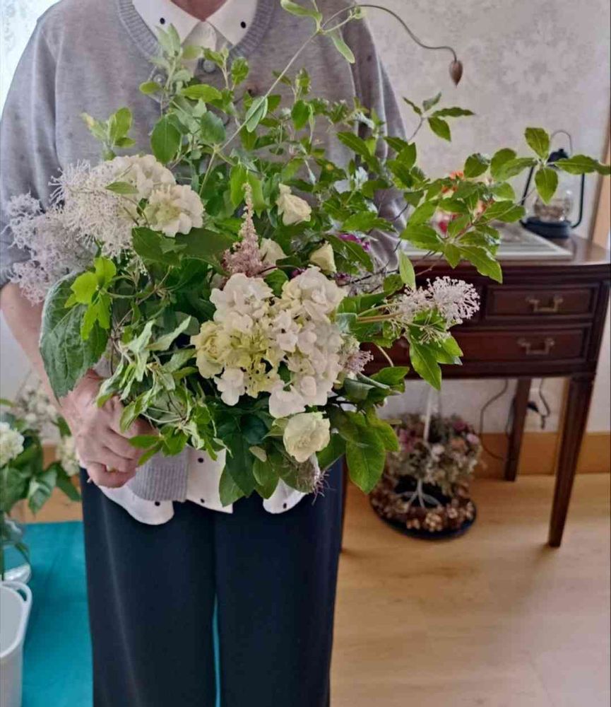 紫陽花の葉っぱを取らずにクッションの役割にして ふんわりできました💐