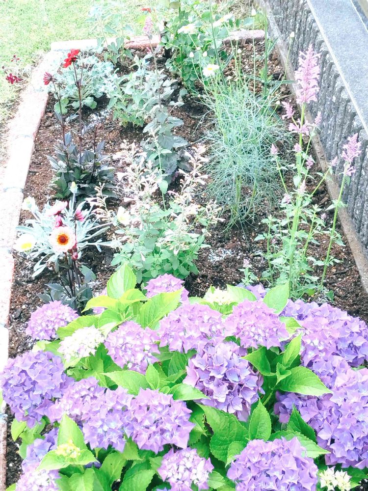 鉢植えにしていた紫陽花をメインにして、集めていた宿根草も植えてみました🏵️