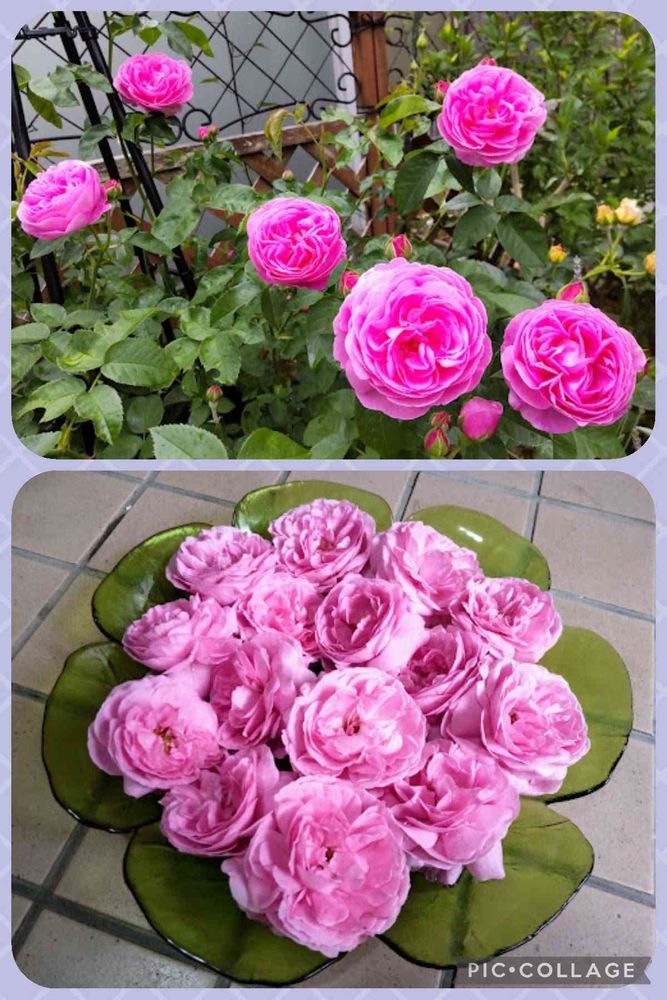 雨の重さで下向きになった🌹✂️。我が家での大きな器に浮かべて💞