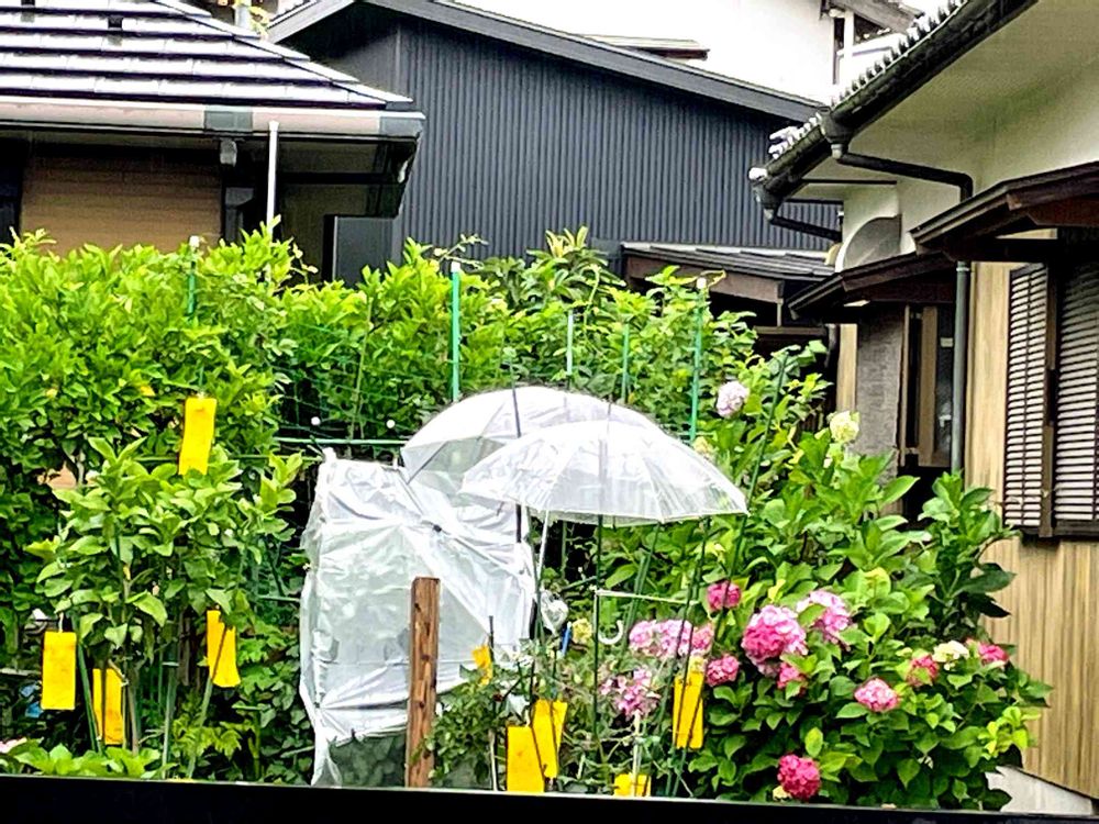 ビニール傘はもしかしてトマトやキュウリを育てているのでしょうか?