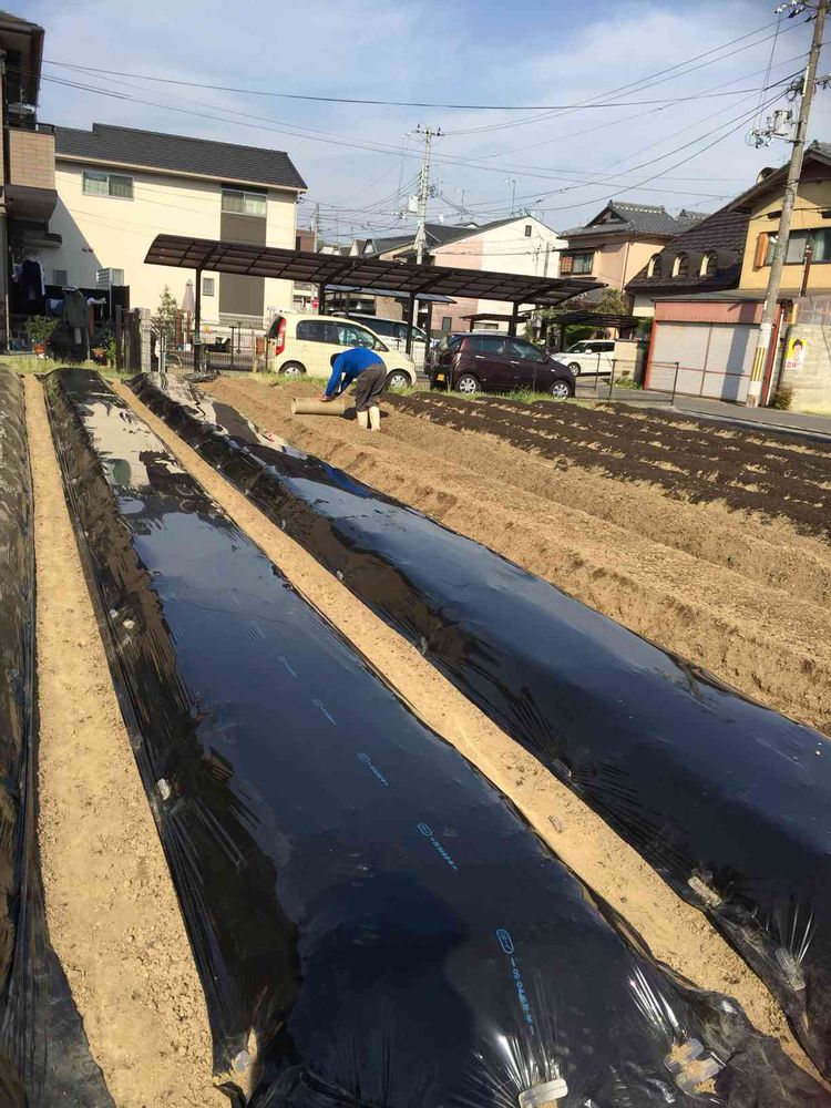 太陽がギラギラしてる時をえらんで 一二の三でマルチを引っ張って…。汗だくで頑張ってます。