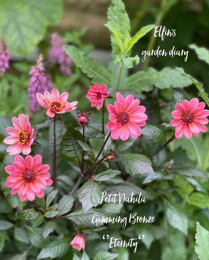 今日の夜の投稿picは、プチダリア ハミングブロンズ ‘’エタニティ‘’。プチダリアの中でも人気の銅葉のダリアです。ピンクとアプリコットを混ぜたような可愛い色で大好きなプチダリアです。去年は、ふたつ植えたプチダリアが花をたくさん咲かせた後、2つともうどん粉病になってしまい、ひとつは、風通しを良くした場所に移動し、ひとつは掘りあげてました。
