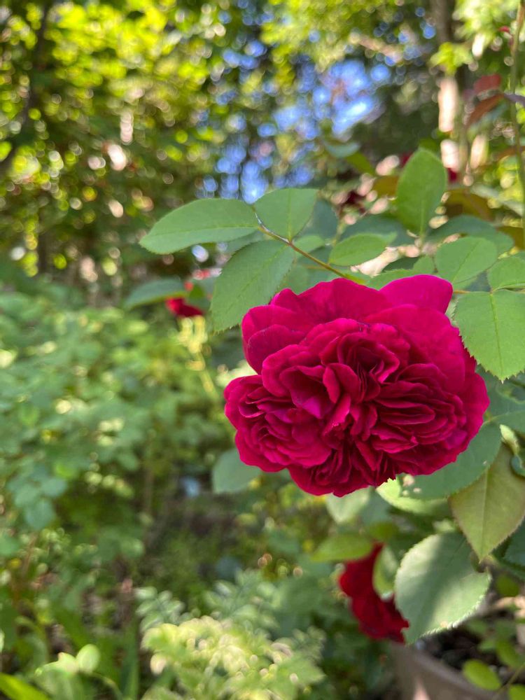 見事ないクォーターロゼット咲きと、艶やかなクリムゾンレッドをupで!