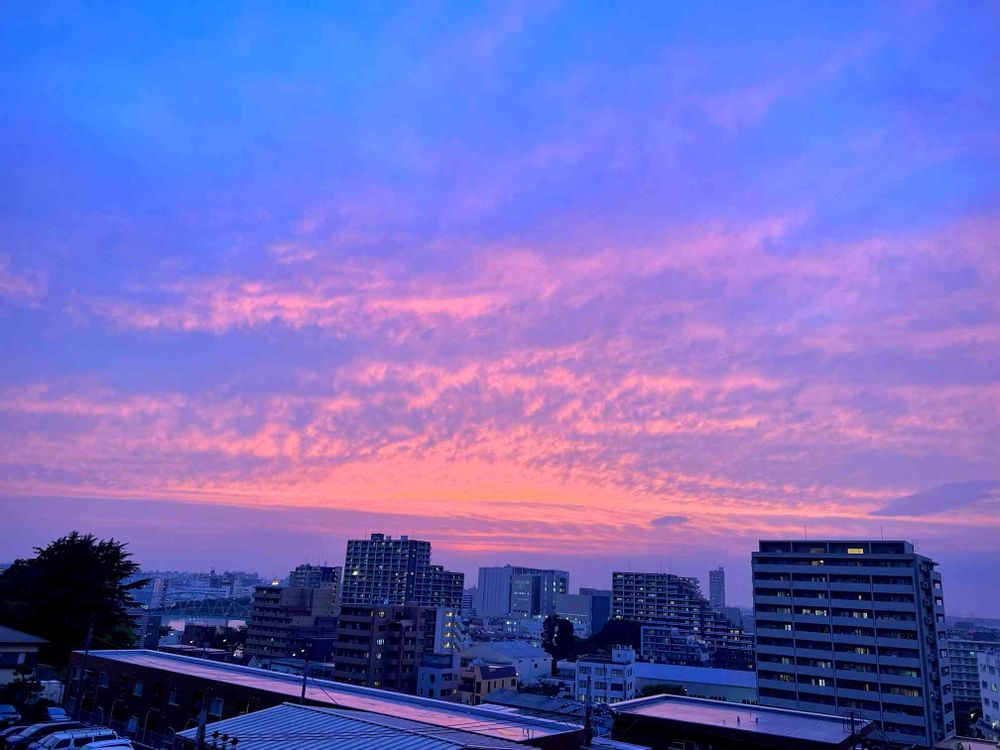 雲が多くて夕焼けが見える隙間が薄かったけど、一瞬ぱーっと紫陽花色の夕焼けが広がりました。