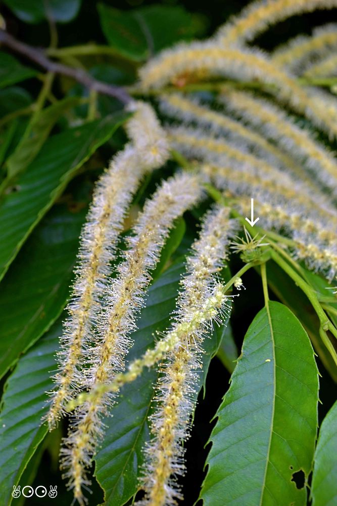 皆さんが よく見る 細長い白いものは 全て【雄花】。雌花は、この雄花の 付け根に 一つだけ有る。 矢印が 【雌花】です。