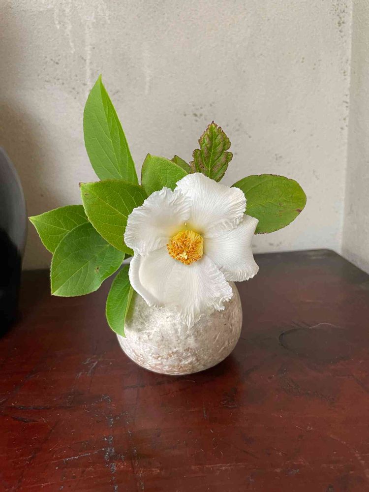 一日花 こちらではひいとい花と呼ばれ、姫沙羅より一回り大きいですが、花弁が、華奢で、とても儚げで美しいです💚