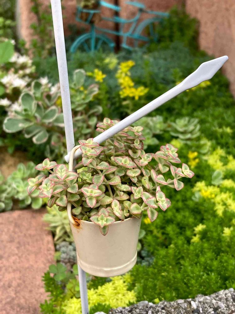 ポスト下セダム畑に下がっているリトルミッシーバケツ。
