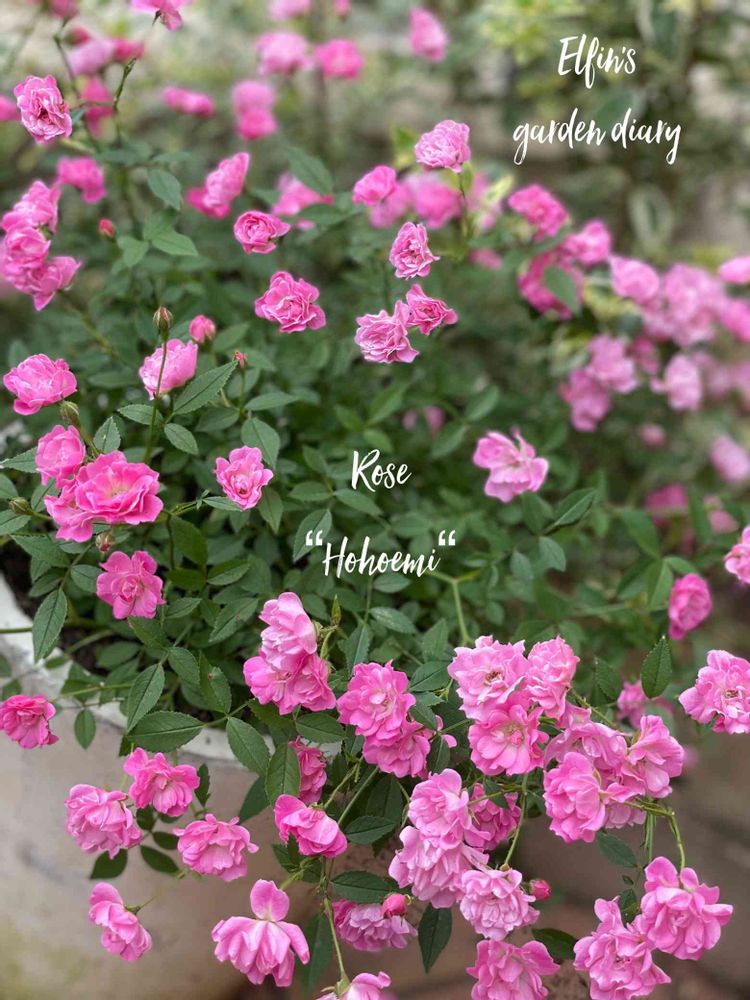 直径1〜2cmほどの四季咲きミニバラで、極小のピンク色の花が いっぱい咲きます。花弁は珍しい剣弁で 枝はしなやか、花色も含め優しい印象の草姿です。