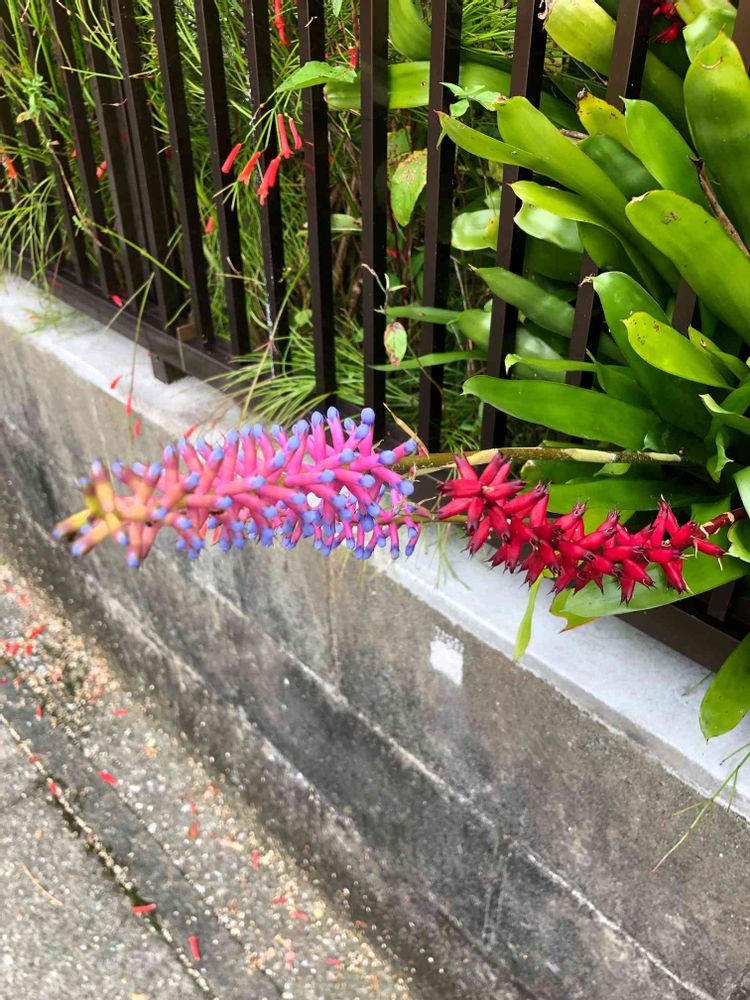 元気よくフェンスから飛び出していますが、何という花か、叔母も知らないようです。赤から紫に変わっていくらしい。