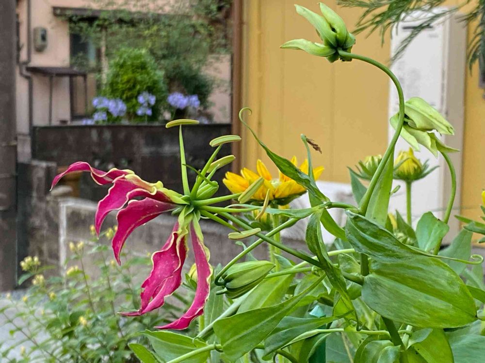 グロリオサ あれ?いない?っと思ったら雨で倒れちゃってました。よっこらしょっと持ち上げました。