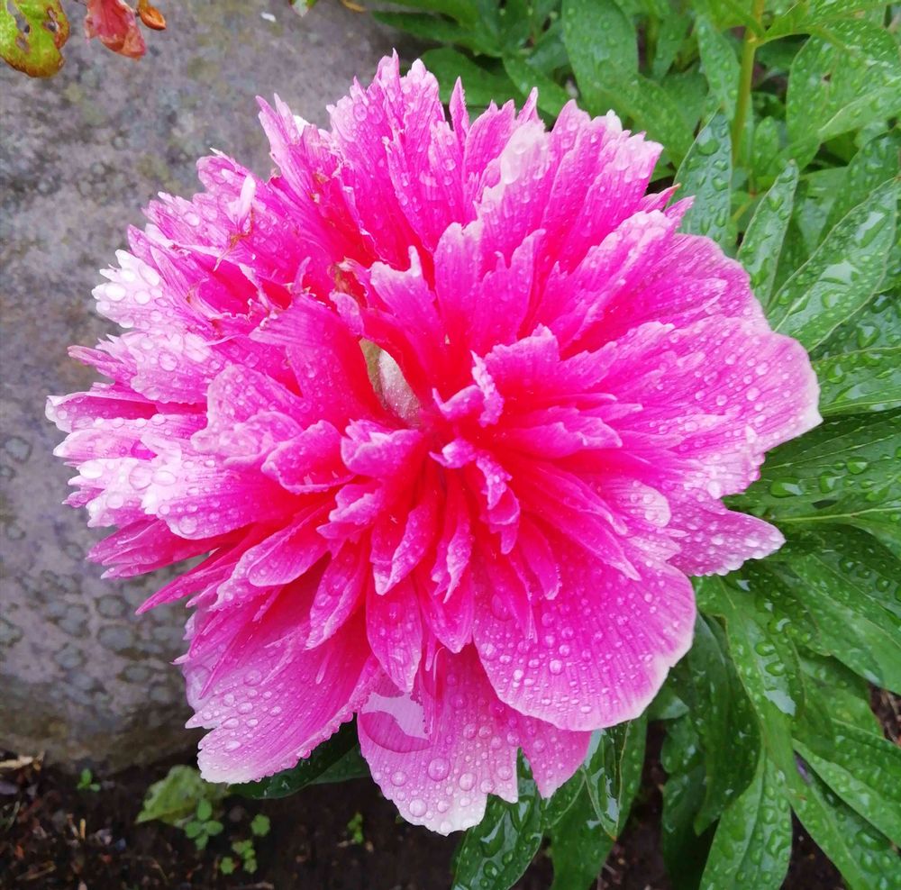 シャクヤクが雨の中咲いていました。可愛い水玉つき。(笑)
