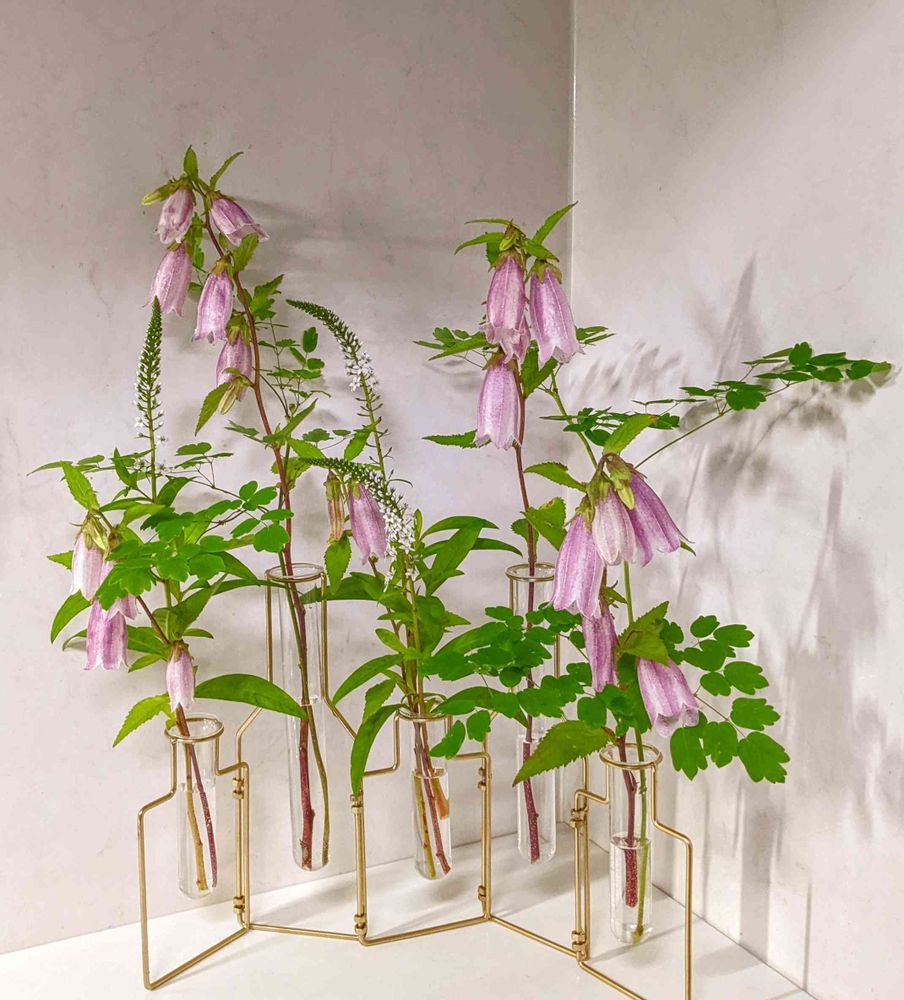 ホタルブクロとススキの葉とも思いましたが🎁のフラワーベースの雰囲気にはあわないかな~とアキカラマツをチョイスしてみました。