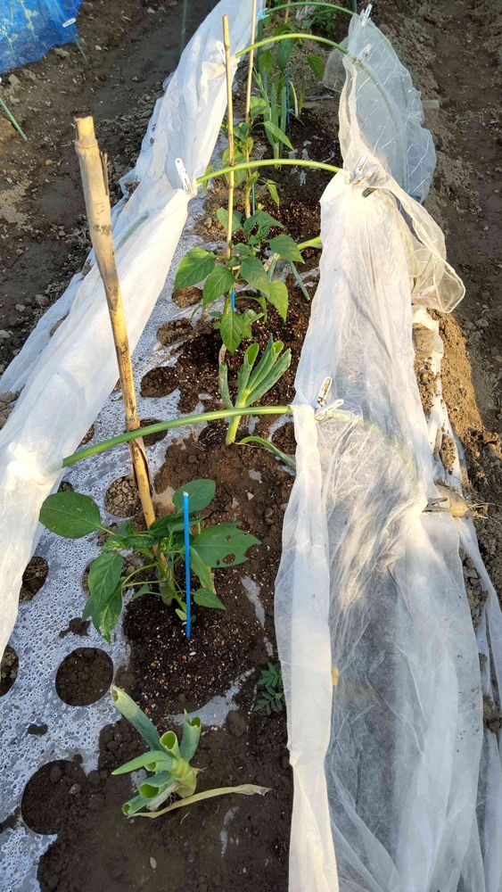 トマト、ピーマン、なすは、接木苗でないと連作障害を起すとのことです。腐葉土、発酵牛フン、発酵けいふん、そして米ぬか、ぬかで微生物の助けを借りてだめもとで挑戦します。1本70円、5本。ネギも株元にて混植しました。
