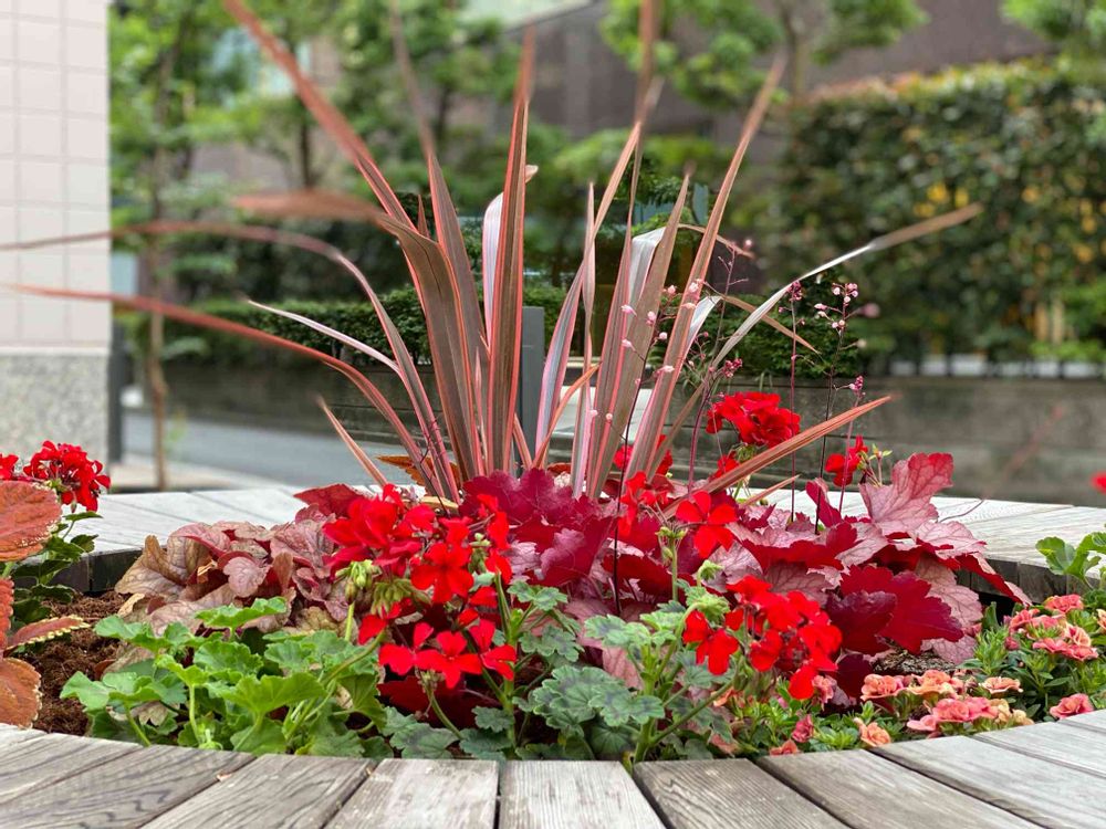 サークルベンチの中花壇をプラン中。。。次回プランの作品が出来るまで間、取り敢えず植えさせてもらいました。これはこれで気に入っているのだけど、高層オフィスビルとのバランス。。。つづく