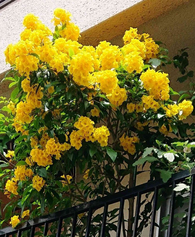 ふと見上げるとよそ様の2階ベランダから、色鮮やかな黄色い花は遠くからでも非常に目立ち明るく彩る景観植物💛🍀