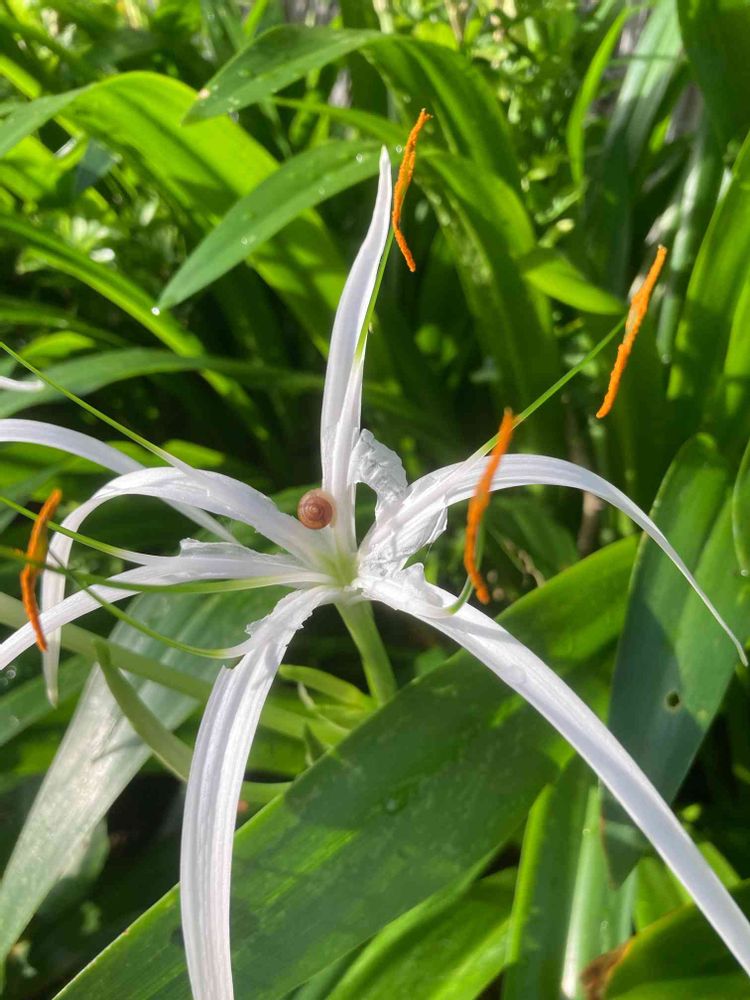雨上がり、ちっちゃい🐌がたくさん出動中、スパイダーリリーにもちょこんといました。恐怖のアフリカマイマイ☠️🐌じゃないから許す笑