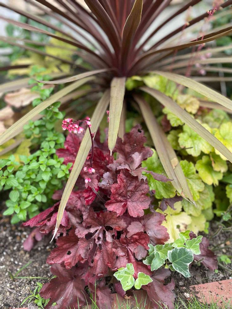 花壇のコルジリネとヒューケラ。コルジリネは風通しをよくする為に下の方の葉っぱをカット。ヒューケラもワサワサになったので株分けして数本は鉢植えに。左側の緑色の葉っぱはカラミンサ。昨年、寄せ植えにしたものを花壇に植え直し、冬越して春には芽吹いてきました😌