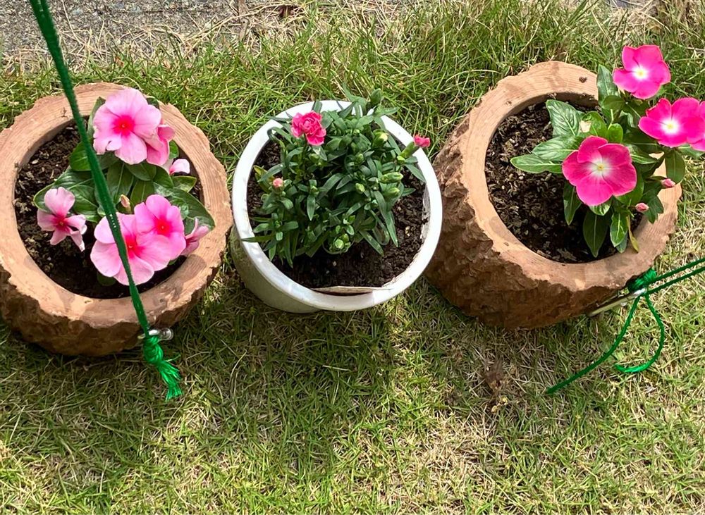 西向きの我が家🏠日差しが差し込まないうちにサンシェード1枚追加取り付け完了💪🏻そしてこのシェード用切り株デザインウェイト🪵一石二鳥なんです🤭底穴があって鉢になります。って事で近くのお花屋さんへ👣日々草×2ポットはウェイト用、かわいらしいカーネーションは値下げされてたので1ポット、3点で330円でした👛ピンクのお花かわいい💕