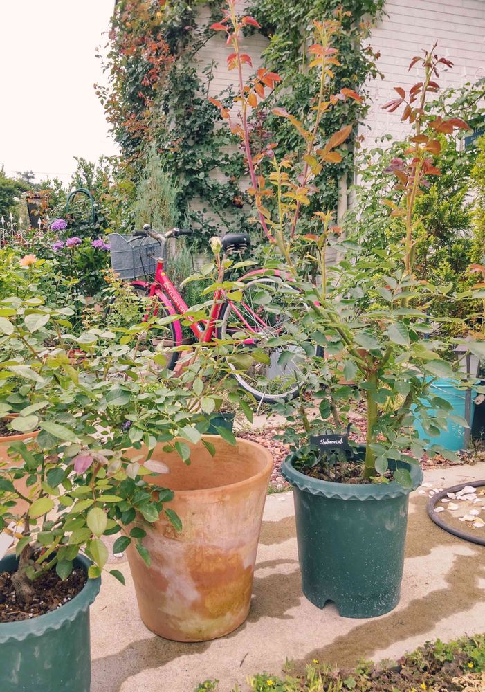 梅雨時期のうちに鉢バラの鉢増しを進めています。