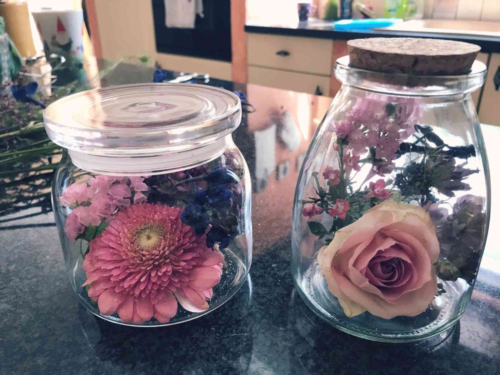 ドライフラワーを瓶詰めにして。ブーケがこんな風に変身するのもまた楽し☺️思い出が残ってくれて