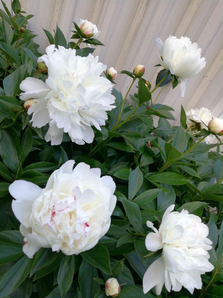 白のシャクヤクが咲き始めました。まっ白が一番好きですが、少しピンクのさし?が混じっています。