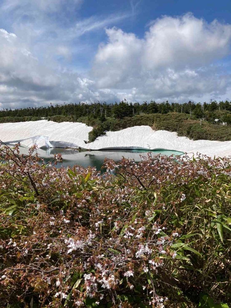 山桜と雪のガマ沼。この日は気温24°