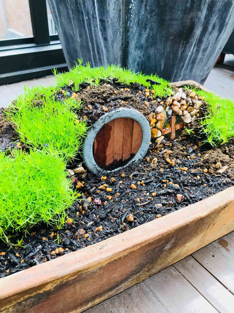 ドア部分は植木鉢に木の板をはめたもの窓はレジンの窓と玉石を固めた壁で土留め まとめで成長日記をつけています。