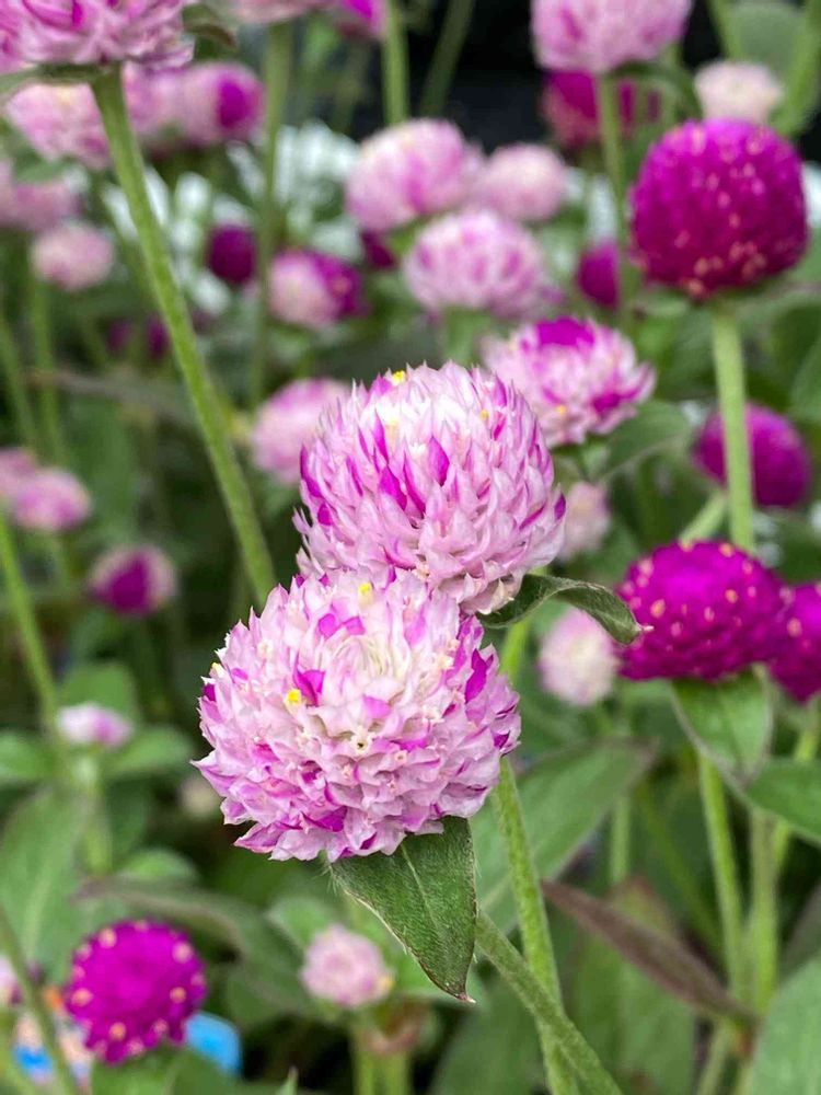 一株から紫や白×紫の混じった花色が出る千日紅です