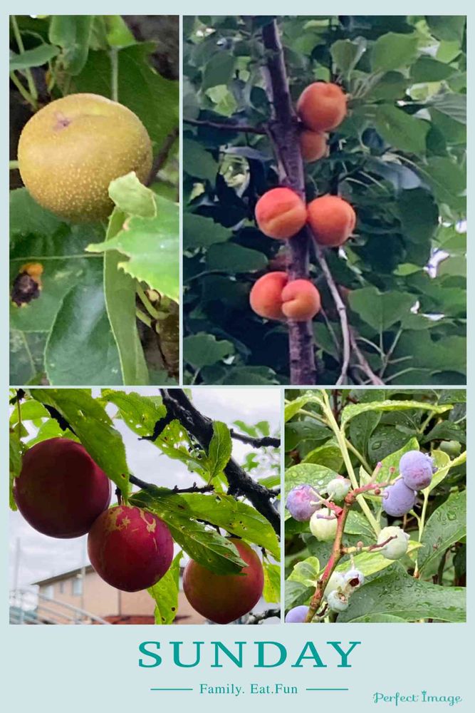 梨、すもも、ブルーベりー、オレンジ色はなんの実かな?葉っぱがビワではないし🤔