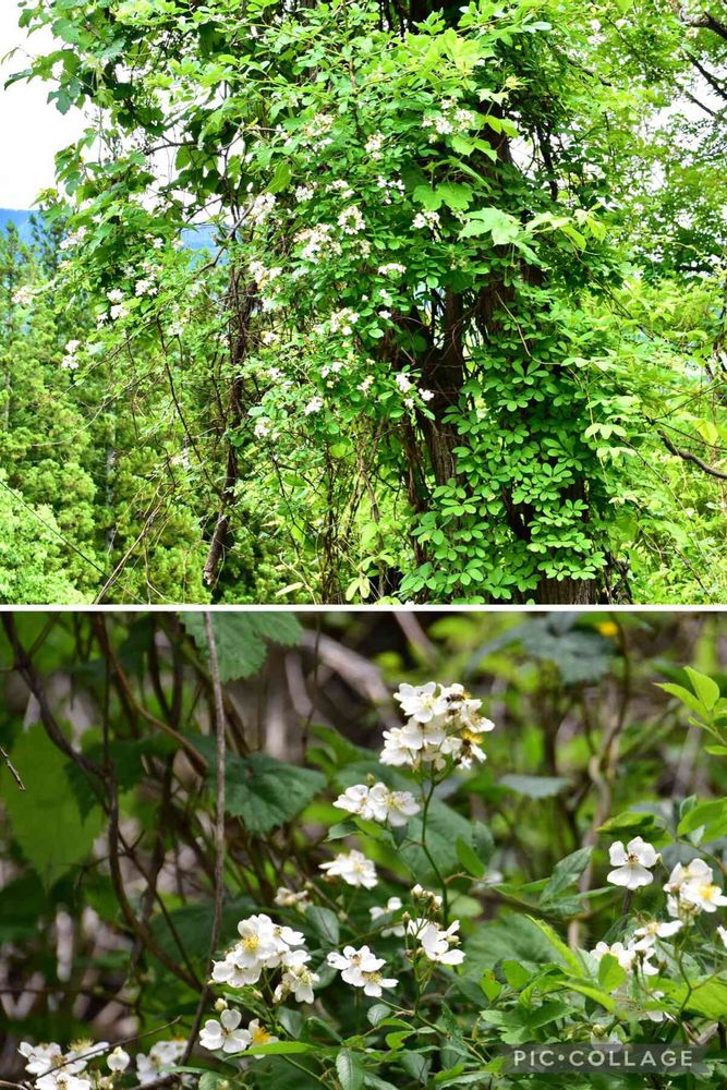崖下から伸び上がってる大きな木に花が巻き付いています。遠目にはツルアジサイかイワガラミかと思ったんですが、近づいてみるとコレは「ノイバラ」みたいですねえ。こんな高い木にまで巻き付いてるのはあんま見たことない😊😆