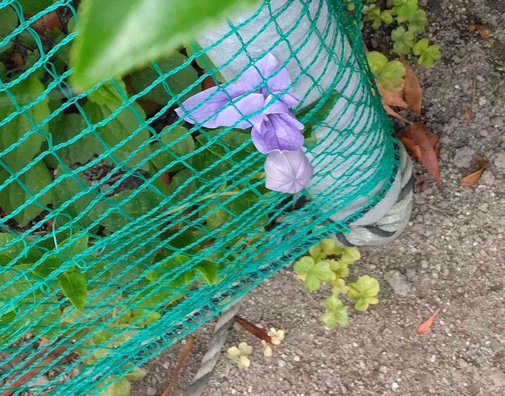 桔梗の花、網に潰されでも開いていた例年より一月遅れ
