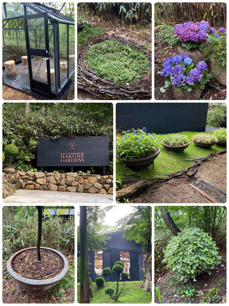 長靴と傘を借りての散策になりましたが、箱根の植物を生かしたオブジェやフラワーアート、黒を基調にした建物や遊歩道が、とても素敵でした💕