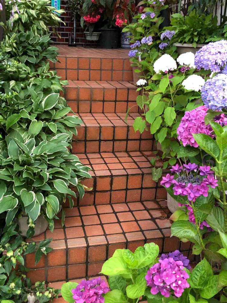 玄関のアプローチ ギボーシと鉢植えアジサイにしました。